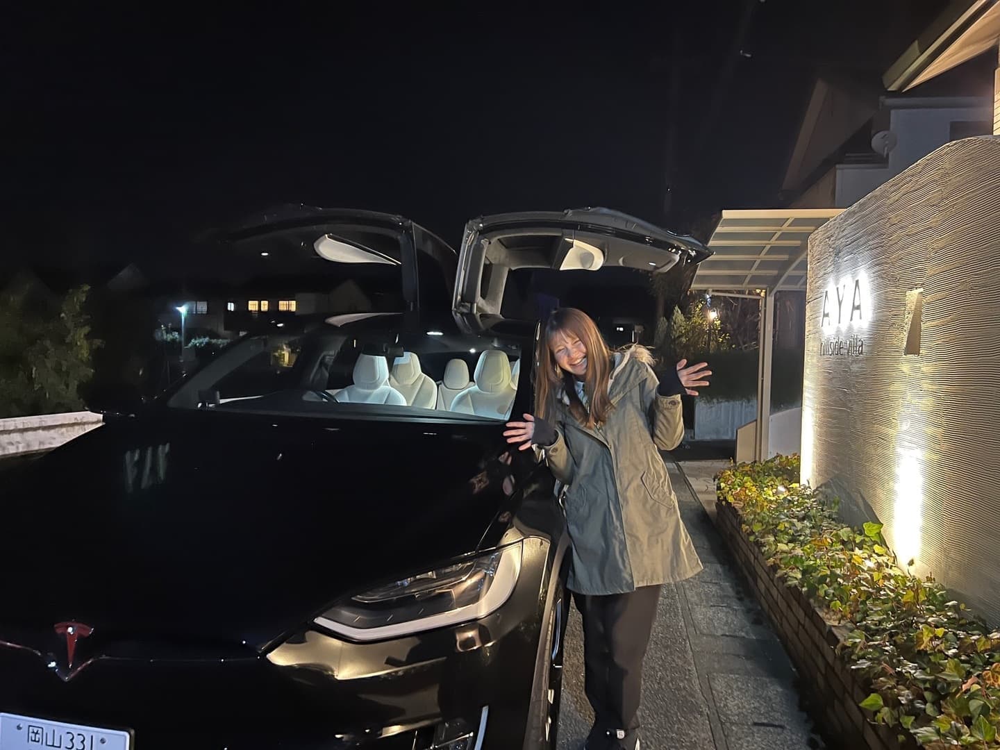 AYA hillside villa, we offer an exclusive private chauffeur service for guests arriving from afar. Driven by the owner personally, our Tesla Model X provides transport to and from Okayama Station or Okayama Airport.