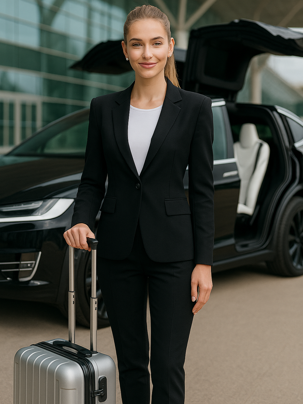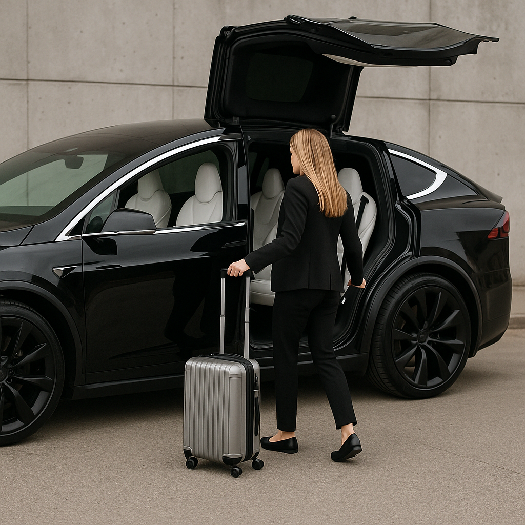 - Our black TESLA Model X will be waiting for you in the general pick-up area.