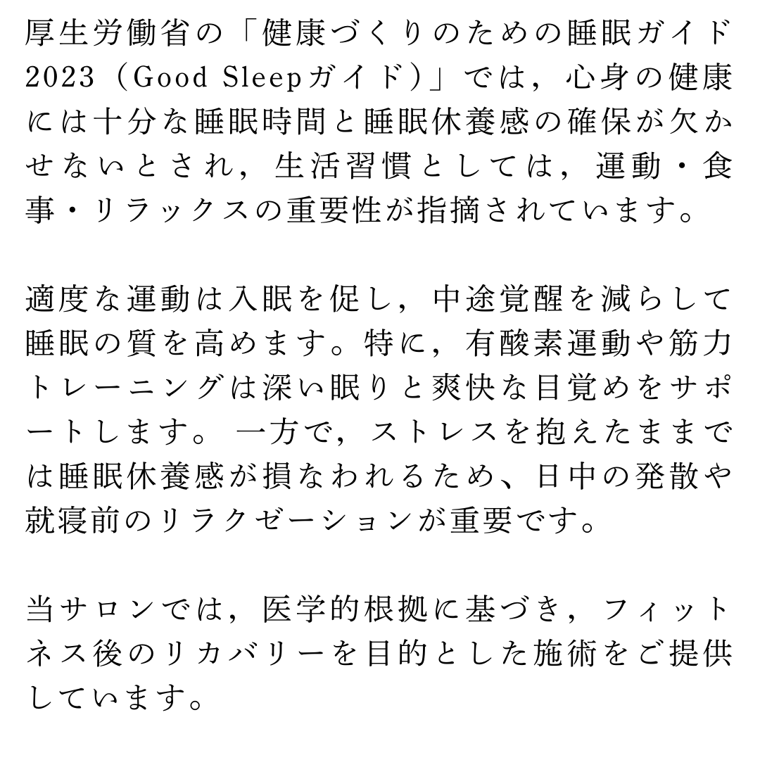 トレーニング後,ウォームダウン不足や疲労,ストレスが強い場合,副交感神経への切り替えがスムーズでないことがあります。リラクゼーションを取り入れることで,副交感神経を優位にし,回復を促進します。ドライヘッドスパは,血行促進や筋肉のこりの解消,そして睡眠の質の向上にも効果があり,トレーニング後の回復をサポートします。
