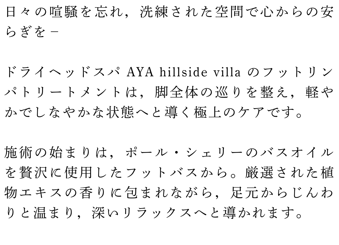 ドライヘッドスパ AYA hillside villa のフットリンパトリートメントは,脚全体の巡りを整え,軽やかでしなやかな状態へと導く極上のケアです。施術の始まりは、ポール・シェリーのバスオイル を贅沢に使用したフットバスから。厳選された植物エキスの香りに包まれながら,足元からじんわりと温まり,深いリラックスへと導かれます。
