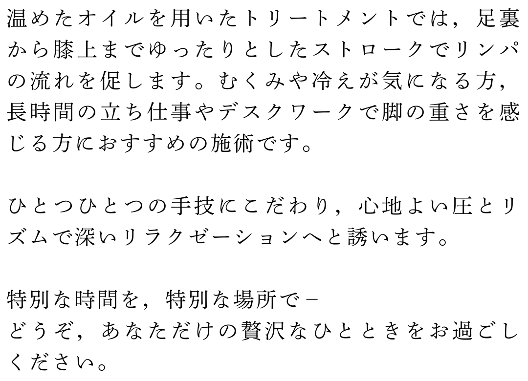 - 温めたオイルを用いたトリートメントでは,足裏から膝上まで流れるようなストロークでリンパの巡りを促進。