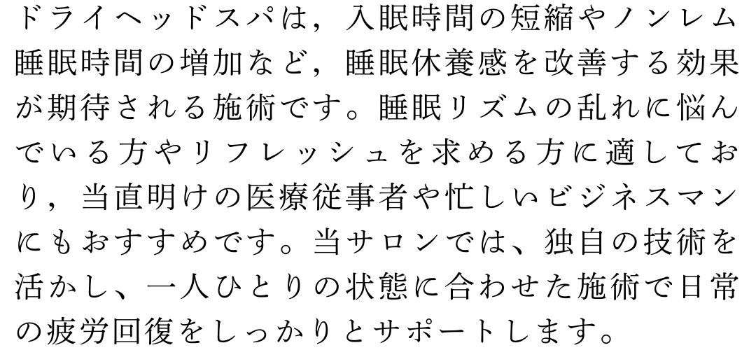 ドライヘッドスパは,日本発祥のヘッドスパの一種であり,髪と頭皮の健康を改善するためのトリートメントです。"ドライ"という言葉が使われるのは,この施術が水を使わずに行われることを意味します。頭痛,肩こり,眼精疲労の軽減,そして睡眠休養感*の向上が期待できます。長時間のパソコンワークやスマートフォンの使い過ぎによって目がお疲れの方,睡眠のリズムが乱れている方,リフレッシュしたい方,お仕事帰りのビジネスマンにもおススメの施術です。