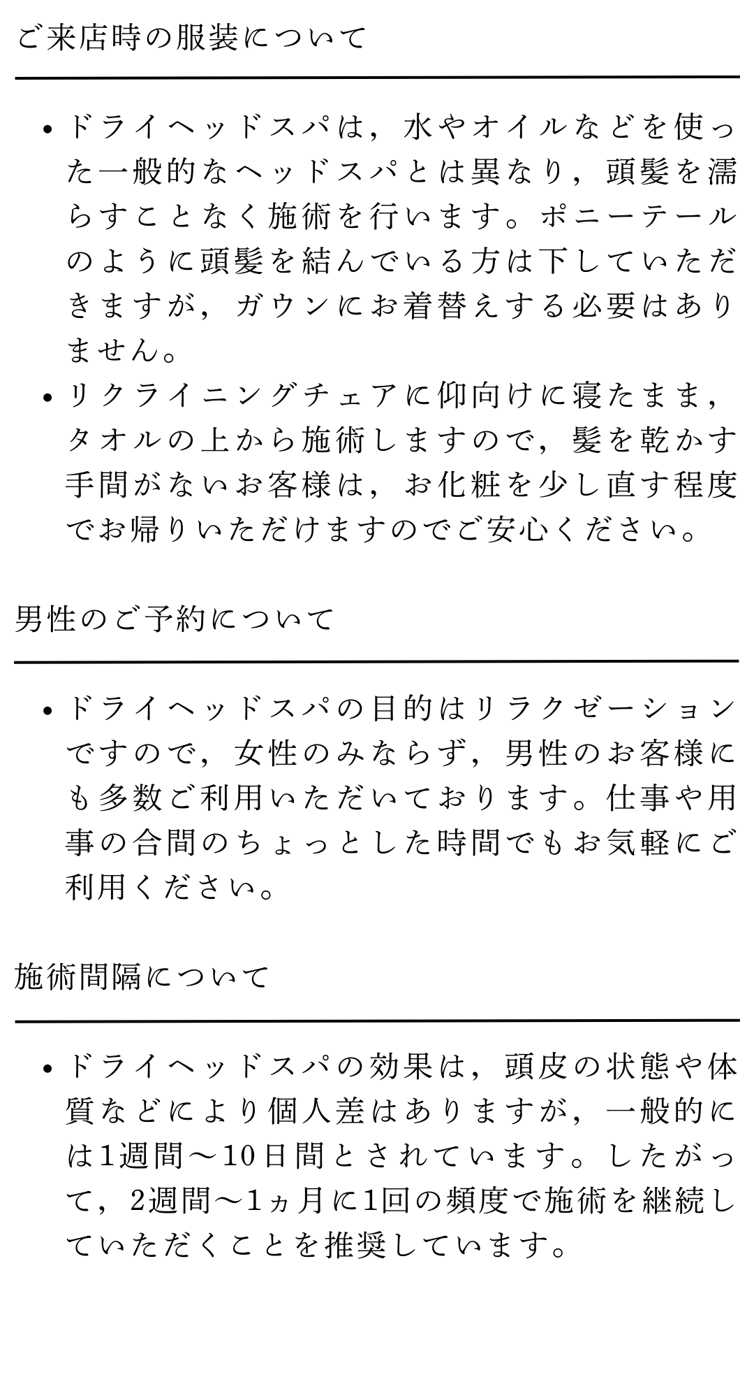 - ドライヘッドスパの目的はリラクゼーションですので,女性のみならず,男性のお客様にも多数ご利用いただいております。仕事や用事の合間のちょっとした時間でもお気軽にご利用ください。