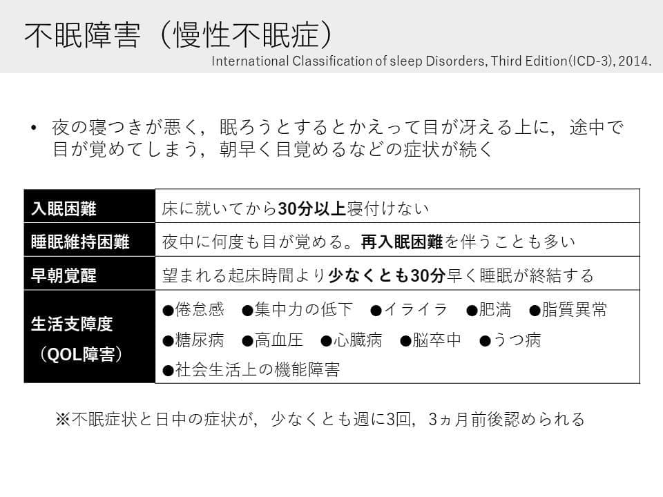 一方,非薬物療法は治療効果の持続性が高いことが明らかにされており,睡眠衛生指導や認知行動療法は重要な選択肢として強く推奨されています。米国内科学会(Qaseem et al., 2016),欧州睡眠学会(Riemann, et al., 2017)では,不眠障害の治療ガイドラインで,CBT-Iが第一選択として推奨されています。日本では,薬物治療が無効もしくは部分寛解の場合,あるいは休薬する際の併用療法としてCBT-Iの実施を推奨しています(三島,2014)。