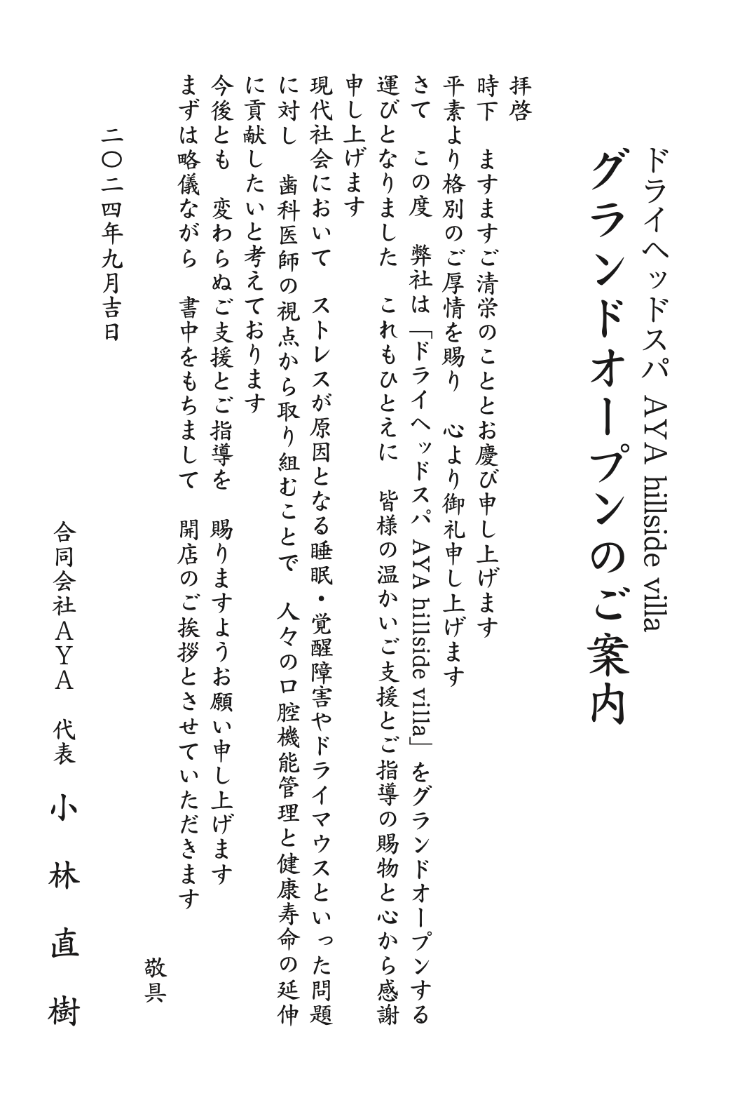このたび「ドライヘッドスパAYA hillside villa」のグランドオープンに際しまして,皆様から心温まるご祝辞ならびに豪華な胡蝶蘭をお贈りいただきましたこと,心より感謝申し上げます。お陰様で,無事にサロンを開業し,多くの方々にご来臨いただくことができました。