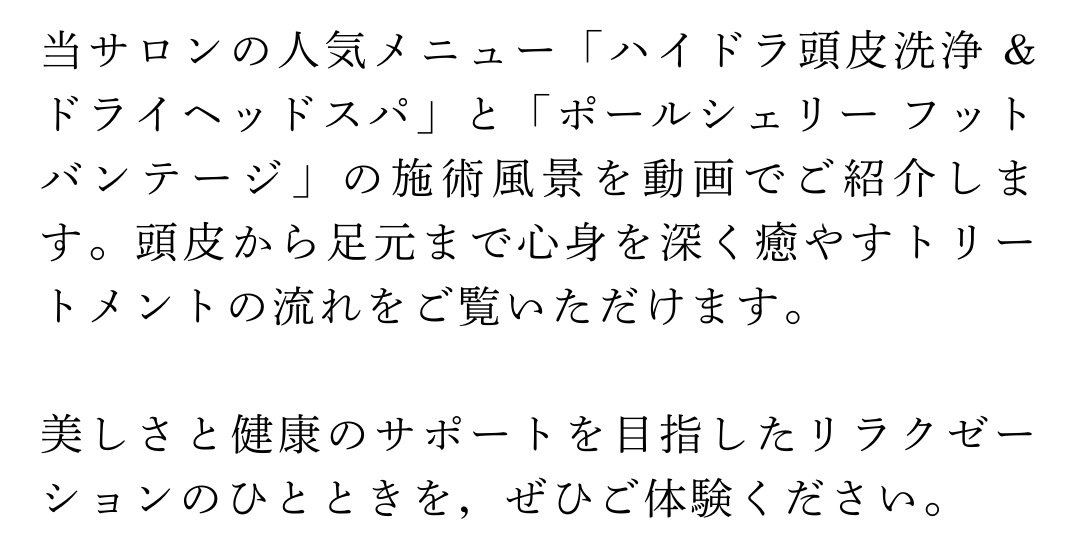 当サロンの人気メニュー「ハイドラ頭皮洗浄 & ドライヘッドスパ」と「ポールシェリー フットバンテージ」の施術風景を動画でご紹介します。頭皮から足元まで心身を深く癒やすトリートメントの流れをご覧いただけます。美しさと健康のサポートを目指したリラクゼーションのひとときを,ぜひご体験ください。