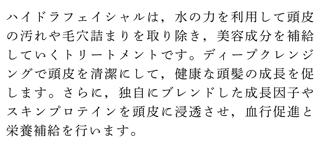 - 頭皮を清潔で健康な状態へと導くハイドラフェイシャルは,他の薄毛治療とも相性の良いアプローチです。