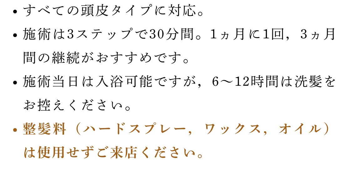 - 施術当日よりご入浴いただけますが,6〜12時間は洗髪(シャンプー・トリートメント)はお控えください。