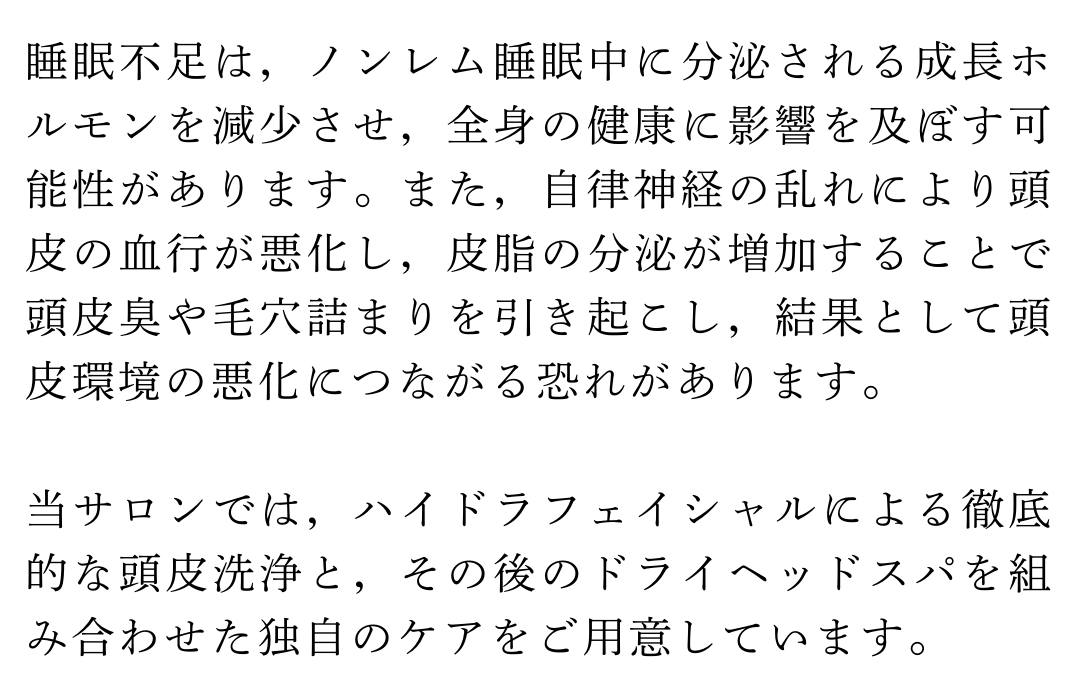 睡眠不足は,ノンレム睡眠中の成長ホルモンの分泌を抑制し,全身の健康に影響を及ぼす可能性があります。特に,頭皮の血行不良や乾燥,毛穴の詰まりなどが起こりやすくなり,頭皮環境の悪化につながる恐れがあります。当サロンでは,ハイドラフェイシャルによる徹底的な頭皮洗浄と,その後のドライヘッドスパを組み合わせた独自のケアをご用意しました。このアプローチは,口腔ケアにおける「清掃と血行促進」の手法から着想を得ており,健康的な頭皮環境の維持を目指しています。