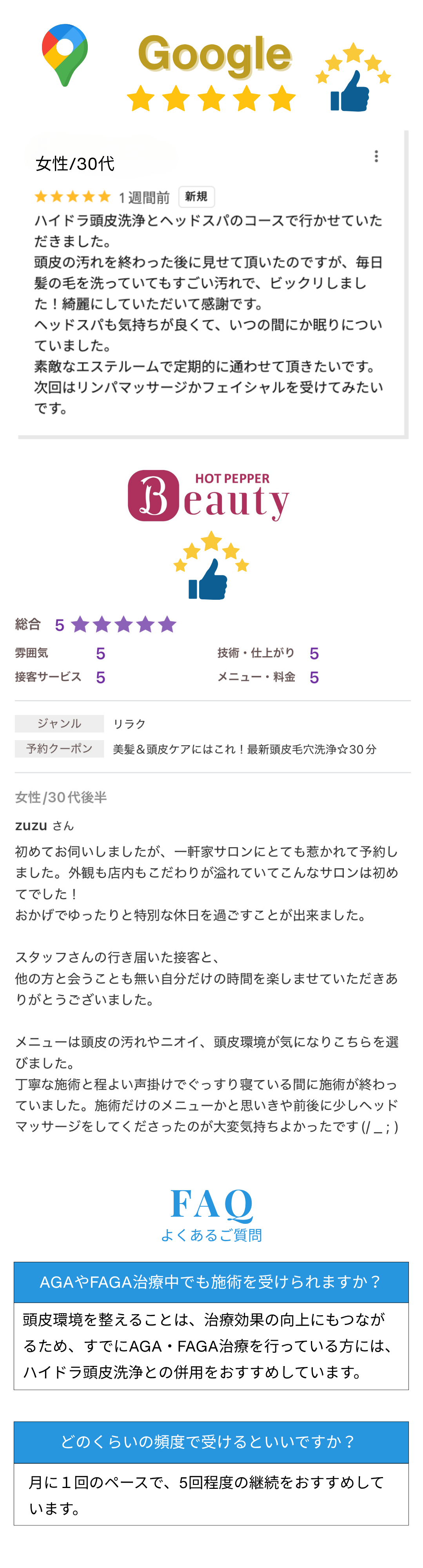 - ハイドラフェイシャルは,頭皮の健康状態を改善するため,すでに行っているAGA,FAGA治療中の方には,ハイドラフェイシャルとの併用をお勧めしています。