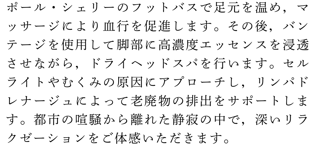 ポール・シェリーのフットバスで足元を温め,マッサージにより血行を促進します。その後,バンテージを使用して脚部に高濃度エッセンスを浸透させながら,ドライヘッドスパを行います。セルライトやむくみの原因にアプローチし,リンパドレナージュによって老廃物の排出をサポートします。都市の喧騒から離れた静寂の中で,深いリラクゼーションをご体感いただきます。