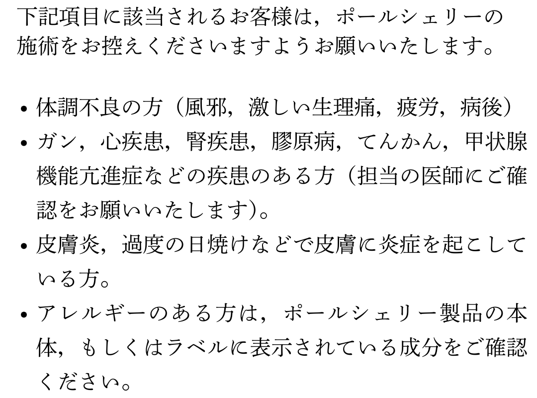 下記項目に該当されるお客様は,ポールシェリーの施術をお控えくださいますようお願いいたします。 | ・ 体調不良の方(風邪,激しい生理痛,疲労,病後) ・ ガン,心疾患,腎疾患,膠原病,てんかん,甲状腺機能亢進症などの疾患のある方(担当の医師にご確認をお願いいたします)。 ・ 皮膚炎,過度の日焼けなどで皮膚に炎症を起こしている方。 ・ アレルギーのある方は,ポールシェリー製品の本体,もしくはラベルに表示されている成分をご確認ください。 |