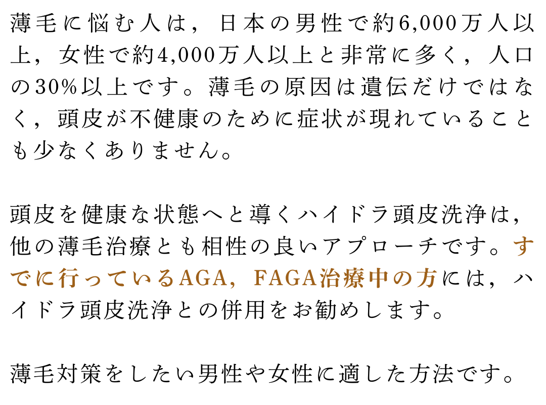 - ハイドラフェイシャルは,頭皮の健康状態を改善するため,すでに行っているAGA,FAGA治療中の方には,ハイドラフェイシャルとの併用をお勧めしています。
