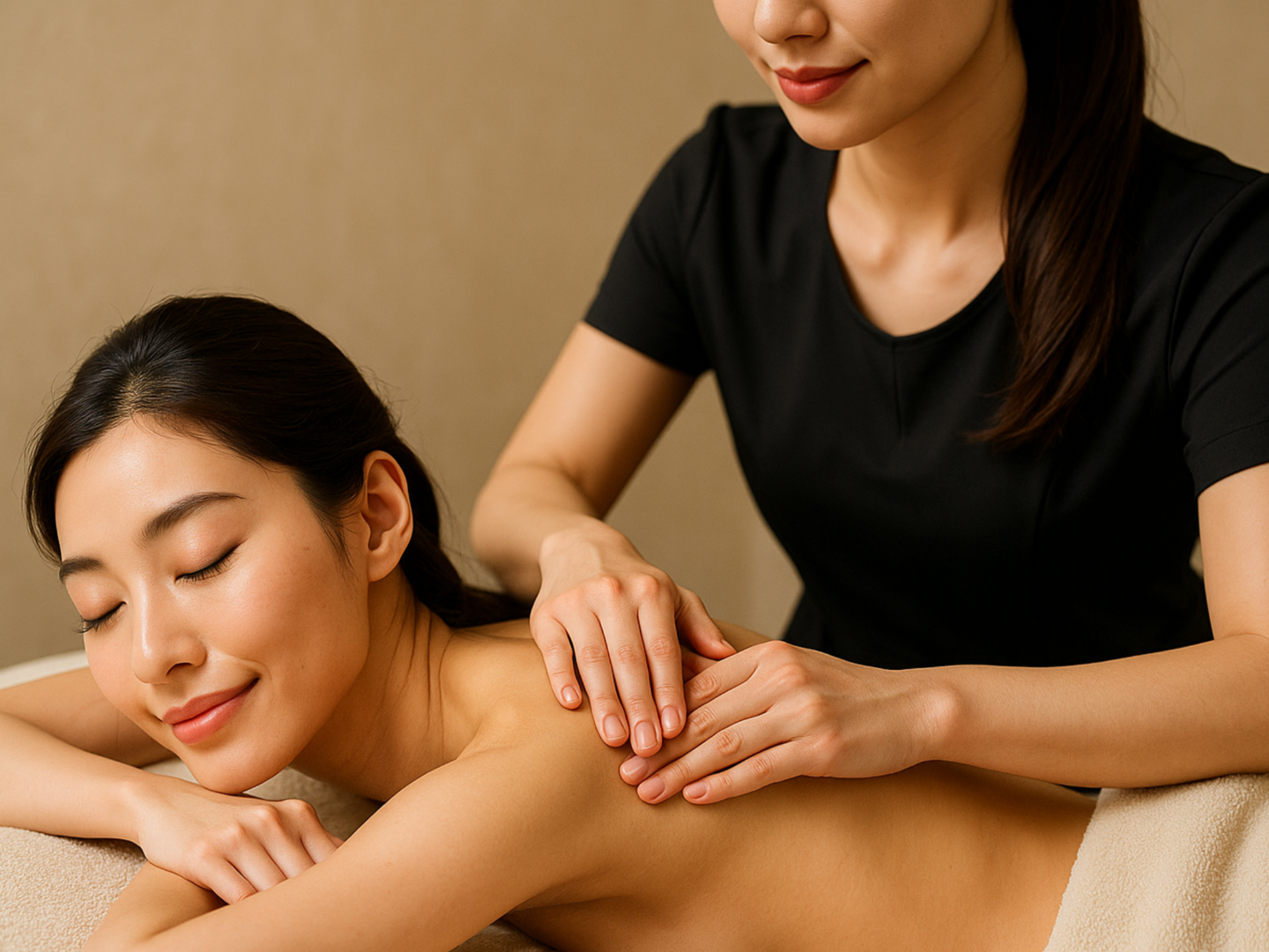 手のひらや指を使い,筋肉やリンパの流れに沿ってロングストロークで筋肉の緊張を和らげます。血液循環と新陳代謝を促すことで,高いデトックス効果と心身の癒しが得られます。
