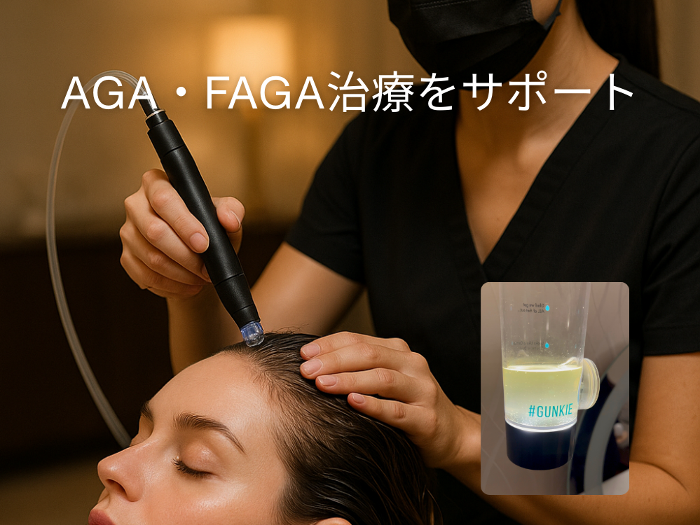 - ハイドラフェイシャルは,頭皮の健康状態を改善するため,すでに行っているAGA,FAGA治療中の方には,ハイドラフェイシャルとの併用をお勧めしています。