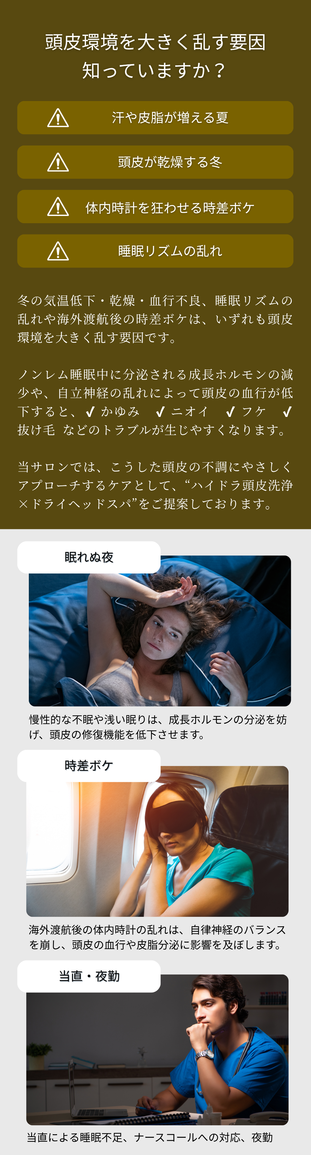 睡眠不足は,ノンレム睡眠中の成長ホルモンの分泌を抑制し,全身の健康に影響を及ぼす可能性があります。特に,頭皮の血行不良や乾燥,毛穴の詰まりなどが起こりやすくなり,頭皮環境の悪化につながる恐れがあります。当サロンでは,ハイドラフェイシャルによる徹底的な頭皮洗浄と,その後のドライヘッドスパを組み合わせた独自のケアをご用意しました。このアプローチは,口腔ケアにおける「清掃と血行促進」の手法から着想を得ており,健康的な頭皮環境の維持を目指しています。