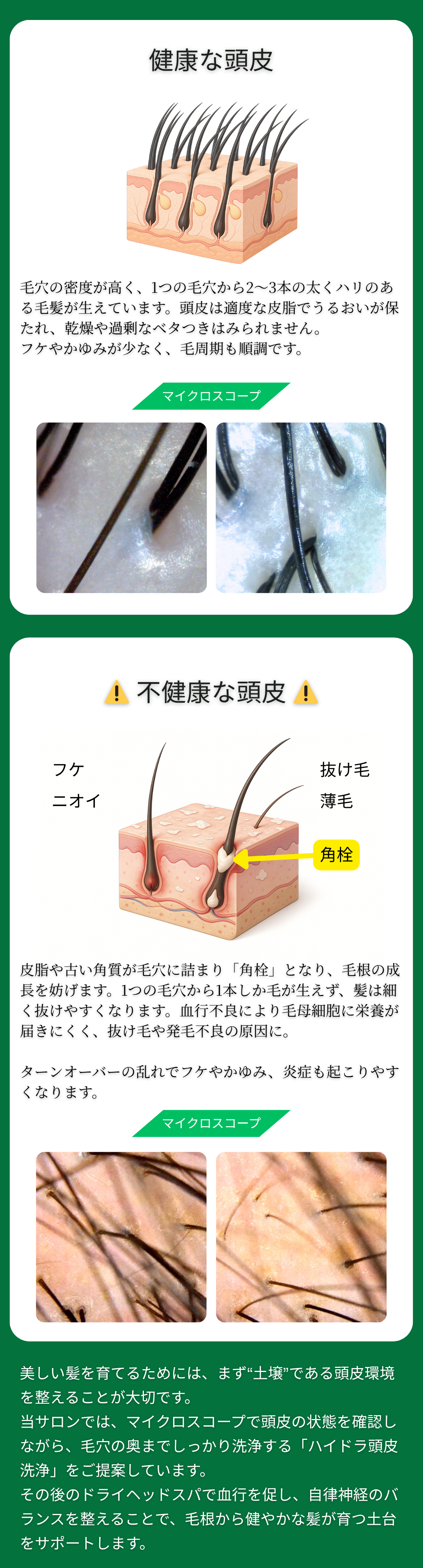 - 毛穴の汚れ:皮脂や整髪料は,日々のシャンプーだけでは取り切れません